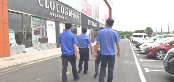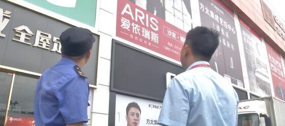 南京棲霞區高力家居港樓棟外立面上,有許多的戶外廣告。今天上午,南京市棲霞區燕子磯大街城管中隊的法律隊員再次來到現場加強巡查,一起叮囑商場管理員,尤其是在今明兩天,要安排保安人員加強巡查,以免在大風氣候裏發生廣告牌墜落砸傷人的情況。