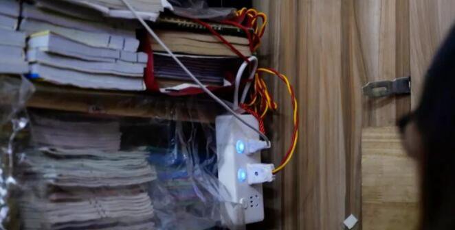 你看一下,這個電線都是暴露出來的,都是沿著這個木板鋪設,一旦這個電線產生打火,就把這個木板給點著了,或者是火花掉下來,把這些塑料袋跟紙皮給點燃了。這個火災風險是非常大的,你這個電線一定要去整一下。